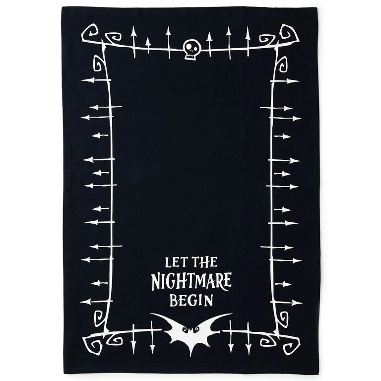 - Disney Tim Burton’s “The Nightmare Before Christmas” cotton tea towel features a printed design of an iron cemetery fence and a spooky quote.