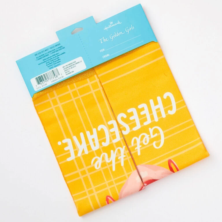 Show off a love for cheesecake and “The Golden Girls” when you wear these adult-size crew socks featuring an illustration of Dorothy Zbornak. A funny quote and plaid design on a yellow background with gold cuff and toe complete the fabulous footwear.