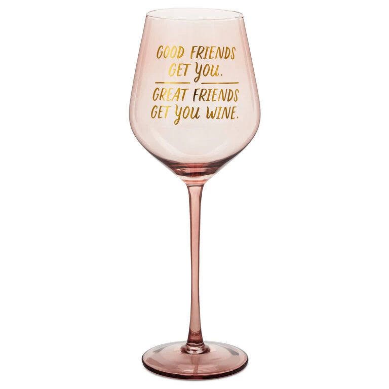Celebrate a close friendship with this pretty coral-colored wine glass that features a humorous sentiment about the difference between good friends and great friends (hint: it involves alcohol). Gold script adds a touch of fancy to your sipping style. Makes a perfect birthday or hostess gift.