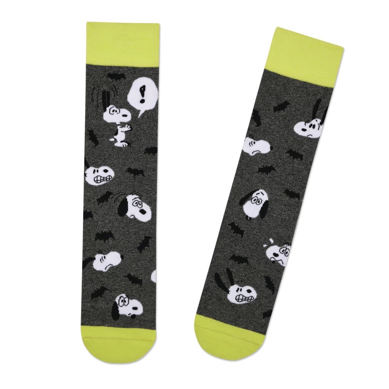 - Peanuts novelty crew socks feature scared Snoopy and bat designs. Chartreuse toes and heels add a fun accent to this footwear.