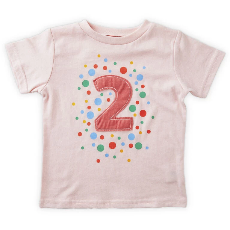 Celebrate the birthday girl as she turns two years old with this cute cotton t-shirt. The number 2 brightly pops against pale pink, surrounded by lots of colorful birthday party confetti to set a festive mood. Just right for declaring a toddler’s second big milestone.