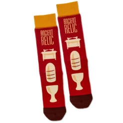 Picture it: A stylish taste-maker becomes the envy of Sicily, Miami and everywhere they go when they wear these adult-size crew socks featuring an illustration of Sophia Petrillo from “The Golden Girls.” A funny quote and stripe design on a pinkish-red background with gold cuff and toe complete the fabulous footwear.
